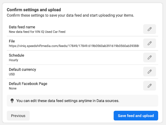 12. Review the settings and click the blue Save feed and upload button if everything looks correct.